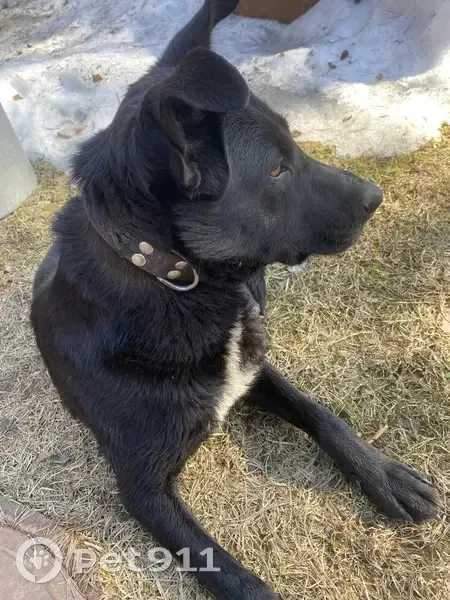 Черный, пятно белое на груди и на кончиках лап. Ошейник широкий черный посередине проходит плетенная косичка.