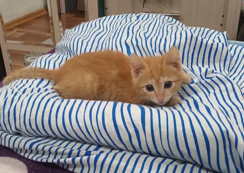 Нашли на улице в районе стройки Лето-парк. Пугалась людей и громко плакала. Светло персиковая кошечка. Животик полный, сытая, но грязная, пыльная. На вид месяца три
