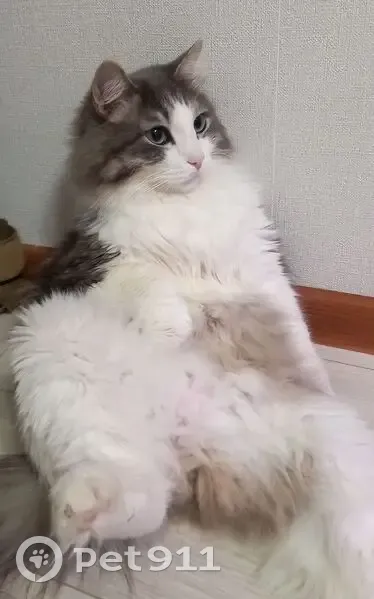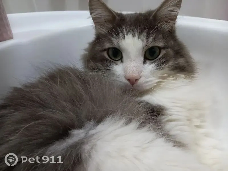 Найден кот. Пушистый, серый с белым, глаза зеленые. Умеет пользоваться лотком. Мкр Радужный. Ищем старых или новых хозяев. Пишите вотсап или тг 89009236842