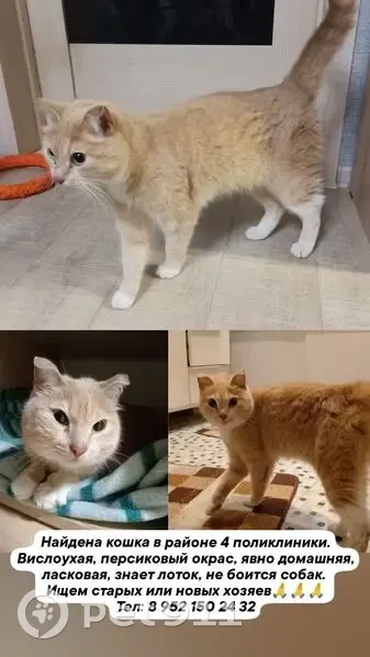 Найдена кошка в районе 4 поликлиники. Окрас - персиковый, красивая, небольшая, возраст не знаю, но молоденькая. Вислоухая, хвост пушистый, очень ласковая, явно домашняя. Знает лоток, не боится собак, не пугливая, трется об ноги и просит погладить. Возможно потерялась. Ищем старых или новых хозяев, готовых подарить тепло и любовь этой персТаисий красотке. Давайте сделаем чудо и найдём к НГ малышке дом Звонить: 8 952 -150 24 32. Таисия