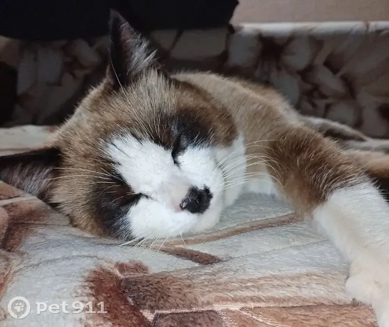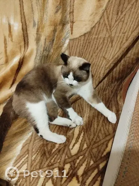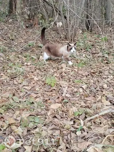 На вид около одного года, окрас похож на сиамца, но брюшко, внутренняя поверхность лап и мордочка, за исключением носа белые. На правом ухе небольшая выщерблинка.