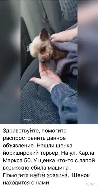 Здравствуйте, помогите распространить данное объявление. Нашли щенка йоркширский терьер. На ул. Карла Маркса 50. У щенка что-то с лапой возможно сбила машина . Помогите найти хозяина. Щенок находится с нами