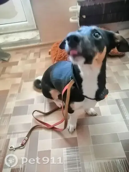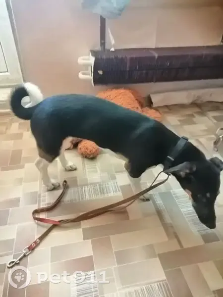 Черная, с белой грудкой и пузом. Длинное тело, хвост колечком, Судя по зубам, примерно год. Была в электроошейнике. Собака бегала по автомобильному кольцу.
