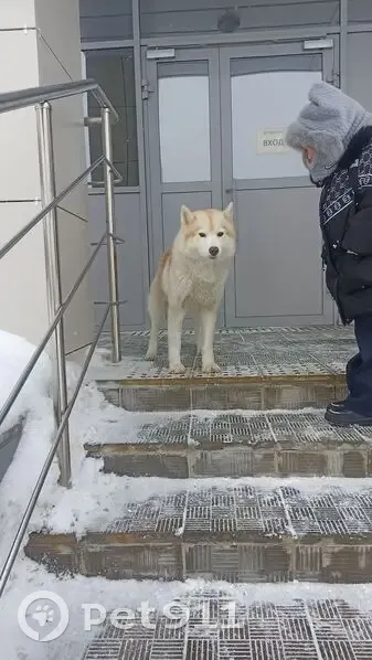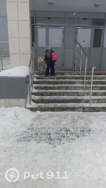 Светлая хаски без ошейника, зашла на территорию школы Открытие