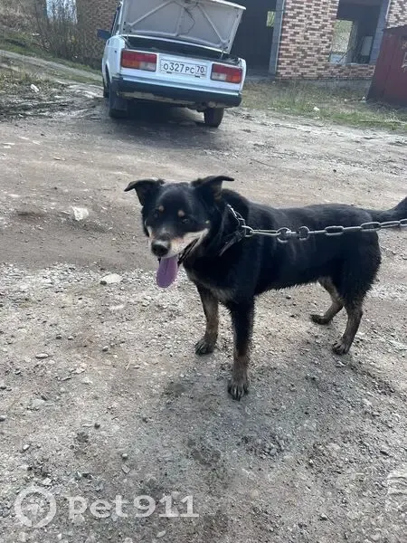 Придержана крупная черная короткошёрстная собака с коричневыми подпалами, бежала по дороге с длинной цепью. Собака контактная и добрая, скучает по хозяину.