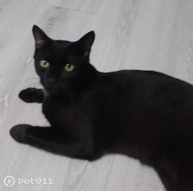 Худощавый, спортивный подросток 9 месяцев, не мяукает. Окрас черный, шерсть блестит, на шее и внизу живота небольшие белые пятна .