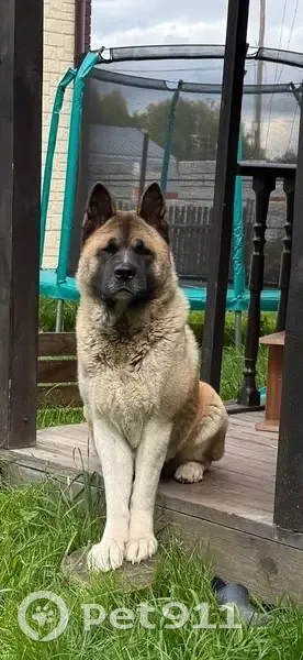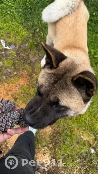Американская Акита рыжего окраса с белым пузом. Темная морда, на носу белая полоска. Очень мышечная собака с мощными лапами. Хвост калачиком. Дружелюбная и не лает