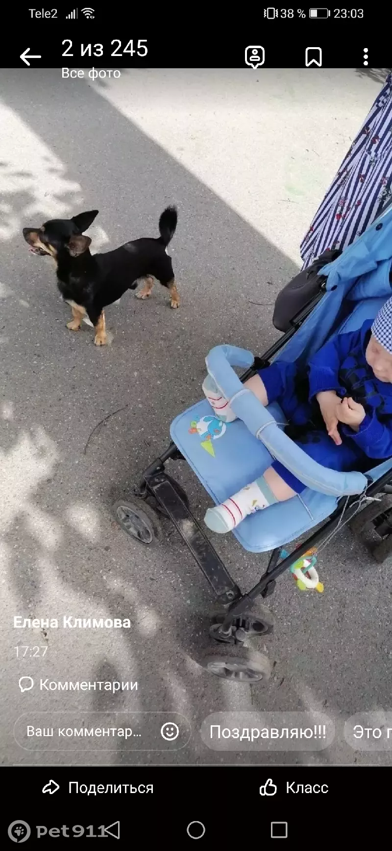 Выбежал из подъезда и пропал, похож на той терьера, чуть больше кошки, чёрный с коричневым лапками и белой грудью