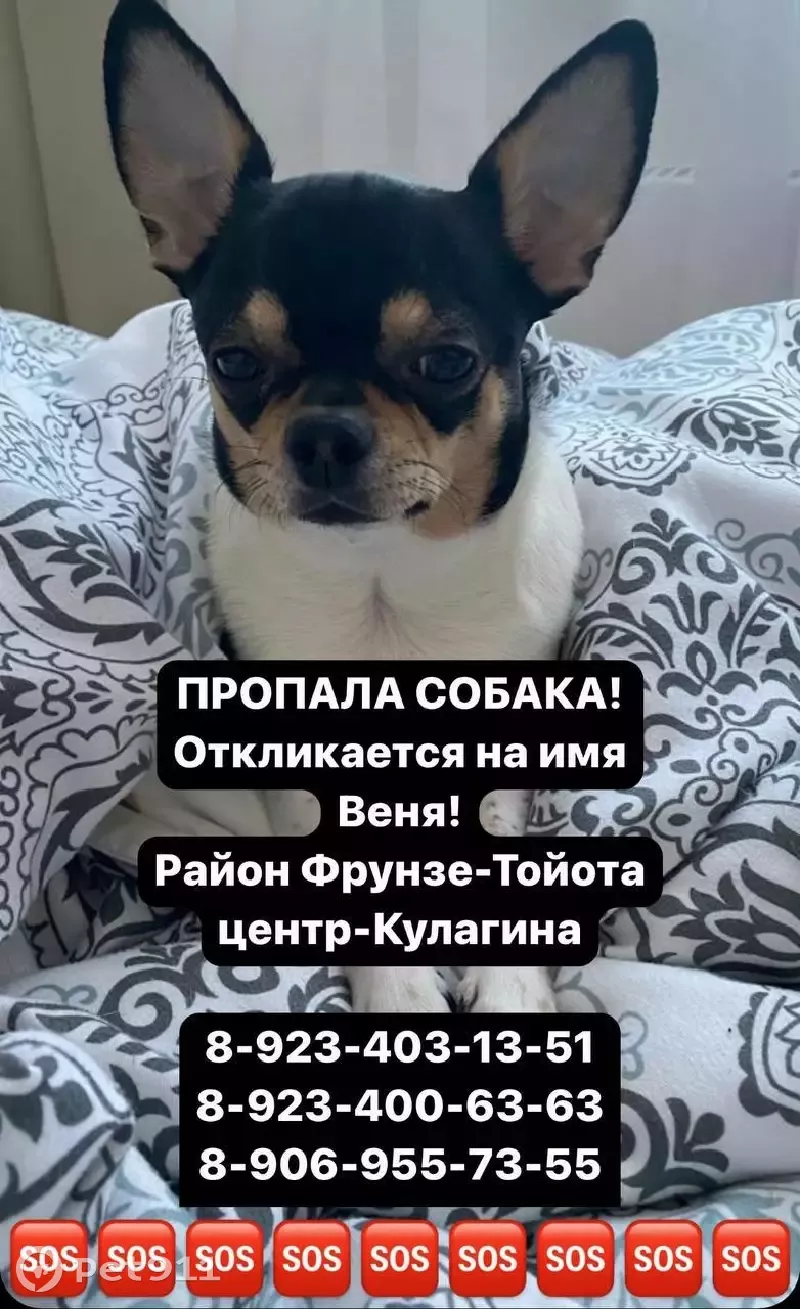 Порода чихуа-хуа, окрас черно-белый ( как у коровы), кличка Веня, немного толстенький Сбежал с пожара, был очень напуган, искали очень долго его, если он кому то попался в руки, верните собаку пожалуйста обратно, эта собака лучший друг ребёнка нашего