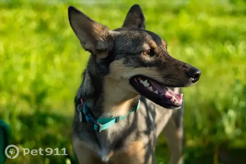 Беспородная ,окрас похожий на овчарку . Небольшого размера . В зелёном (бирюзовом ошейнике)