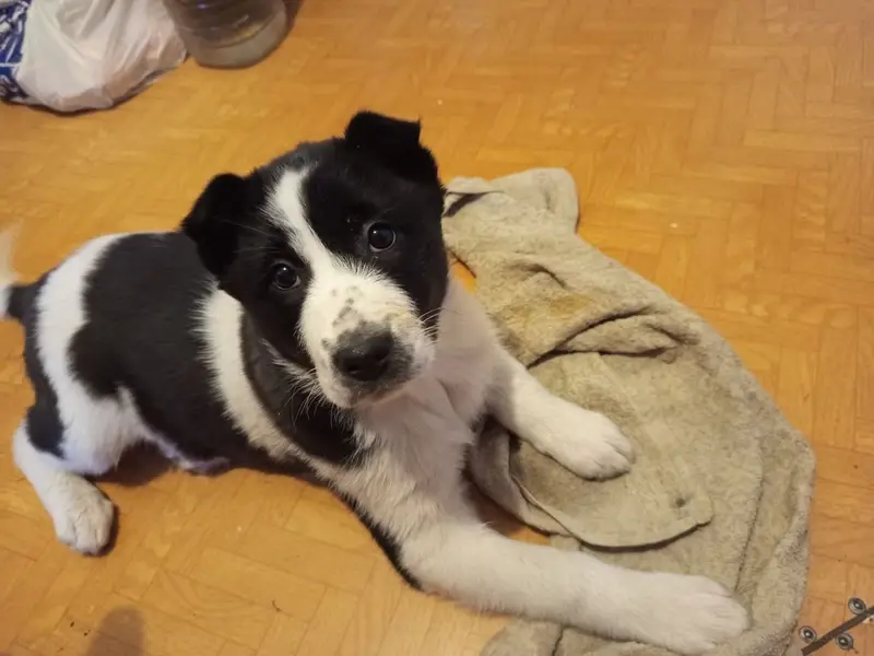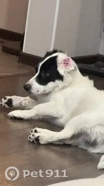 Белая собака, с черными ушами. В длину примерно 70см, а в высоту 30-40см, маленькая собака. Гуляли по двору, испугался машины и убежал под другую машину на парковке, там видели в последний раз.