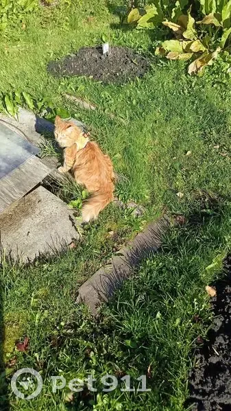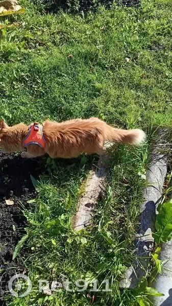 Рыжий, пушистый кот, одет был шлейка жилетка оранжевого цвета, пугливый, может прятаться под домами, сараями, гулял на даче садовое общество Заря 2 , 4 съезд , участок 367.