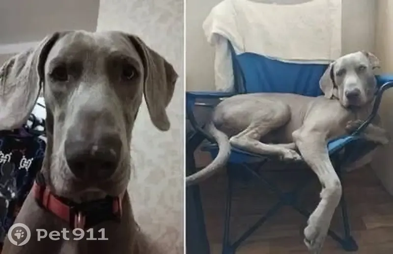 Веймаранер, Окрас серый, светлые глаза, гладкошерстный, поджарый, высокий, с длинным хвостом. Ехали по трассе, забежал в лесок, и исчез. Буквально за 5 минут.