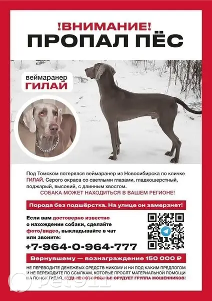 Веймаранер из Новосибирска по кличке Гилай ПРОПАЛ 9 октября 2025 недалеко от г. Томск, в районе пос. Суетиловка. В данный момент местонахождение неизвестно! Окрас серо-голубой, поджарый, глаза светлые, хвост не купирован, без подшерстка. #Гилай чипирован. Возможно его кто-то подобрал, подумав что он брошенный и увез, не знает, что хозяин его ищет. Вернувшему вознаграждение 150 000р Собака может быть и в Вашем регионе! Просим не оставаться равнодушными, и связаться с хозяином, если есть какая-то информация о местонахождении пса: +79640964777 Александр +79994955103 #пропаласобака