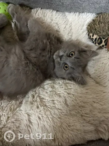 серый котик, пушистый хвостик, сам он кудрявый, ушки большие, глаза маленькие, лапки большие