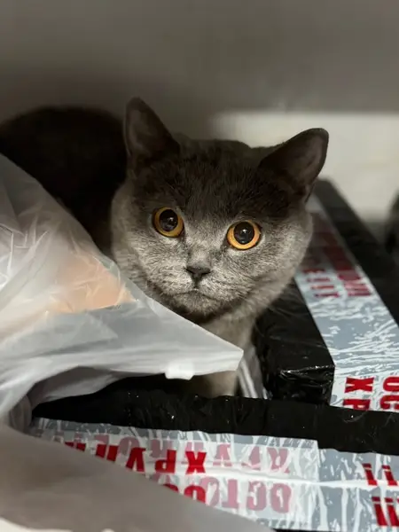 Мальчик. Похож на британца. Серо-голубой, плюшевый. На животе внизу около задних лап посередине белое пятно. Очень ласковый. Неуклюжий. Крупный. Зовут Яша.