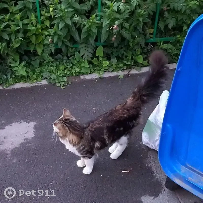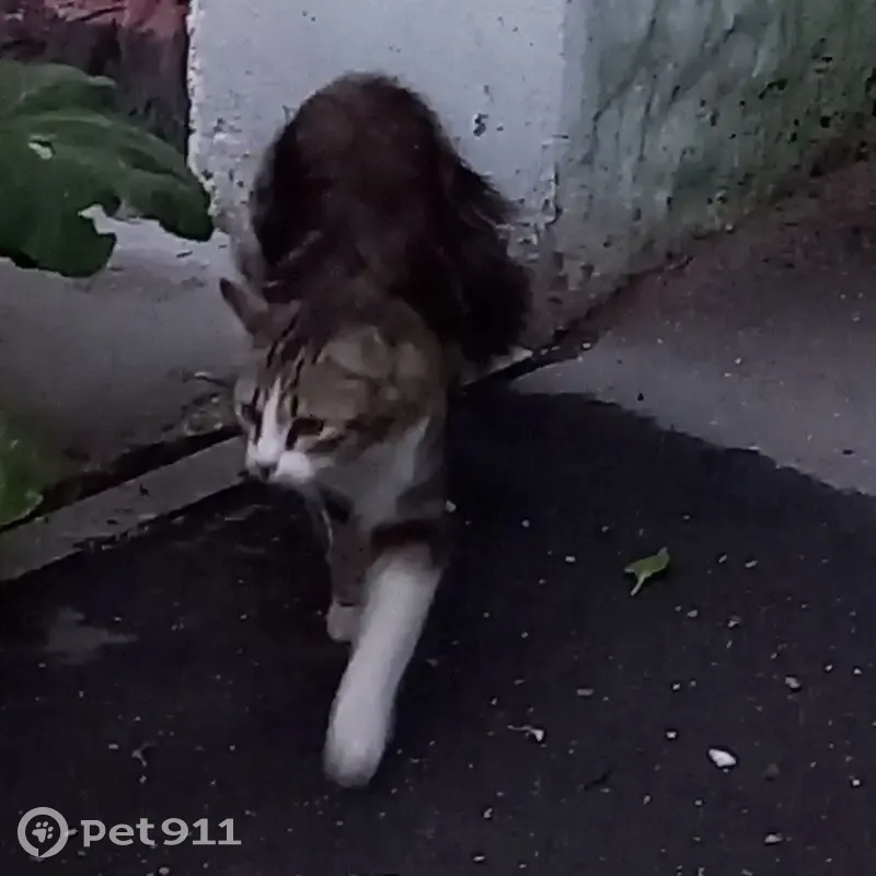 Кошка с шикарным хвостом, окрас "дворовый полосатый" с белыми лапами и грудкой, с белым пятном на носу, поведение спокойное, осторожное. Бегала у подъезда недалеко от ТЦ Рио.
