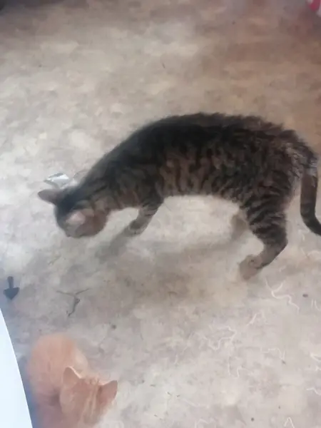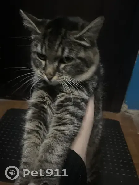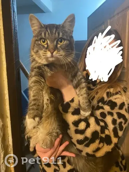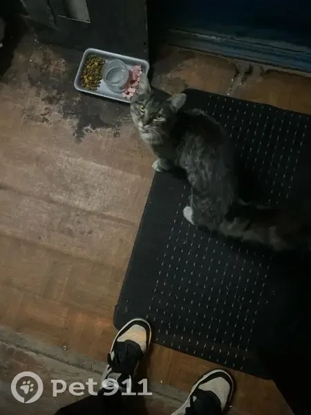 Нашли полосатую, серую кошку в час ночи, на детской площадке. На ней одет розовый ошейник с карабином. Взять себе не можем, кошка старая и по состоянию здоровья без прививок. Целый день находится в подъезде, не выходит на улицу. Очень хочет зайти в квартиру.