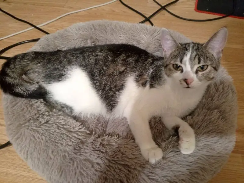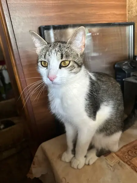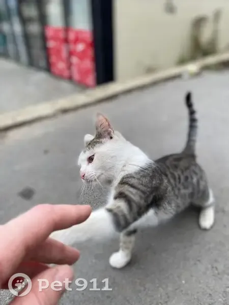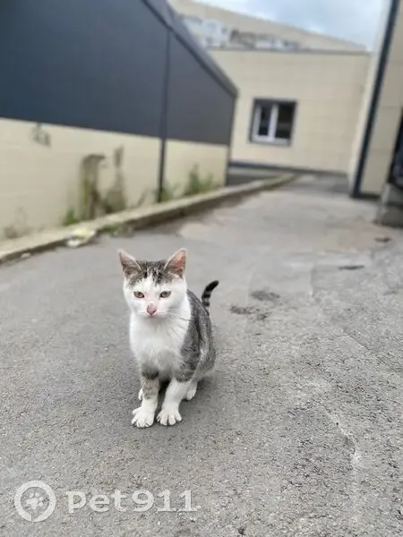 Найдена кошка/ кот миниатюрный подросток. Белая с серыми пятнышками. Явно потеряшка, т. К. Бегает потерянно и не знает куда деться, забегает под машины, видимо, погреться. Покормили, забрать не смогли. Улица Кауля. Красный перекоп