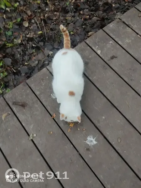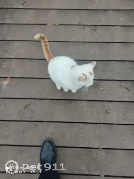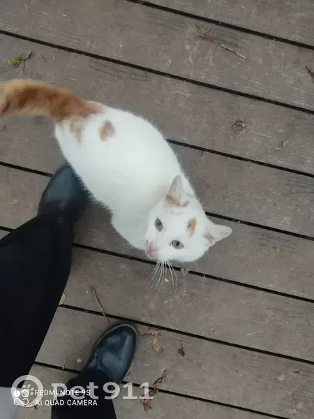 Очень ласковый белый чистый котик с рыжим хвостиком и пятнышка на мордочке, умный . Видео, что домашний. Всегда голодный ждёт на мостике людей, вдруг кто покормит.