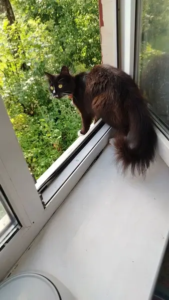 Сидит в подъезде на батарее. Видно что домашняя , на шее синий ошейник. Покормила , взять к себе не могу ,у самой кошка дома с инфекцией, вдруг заразит