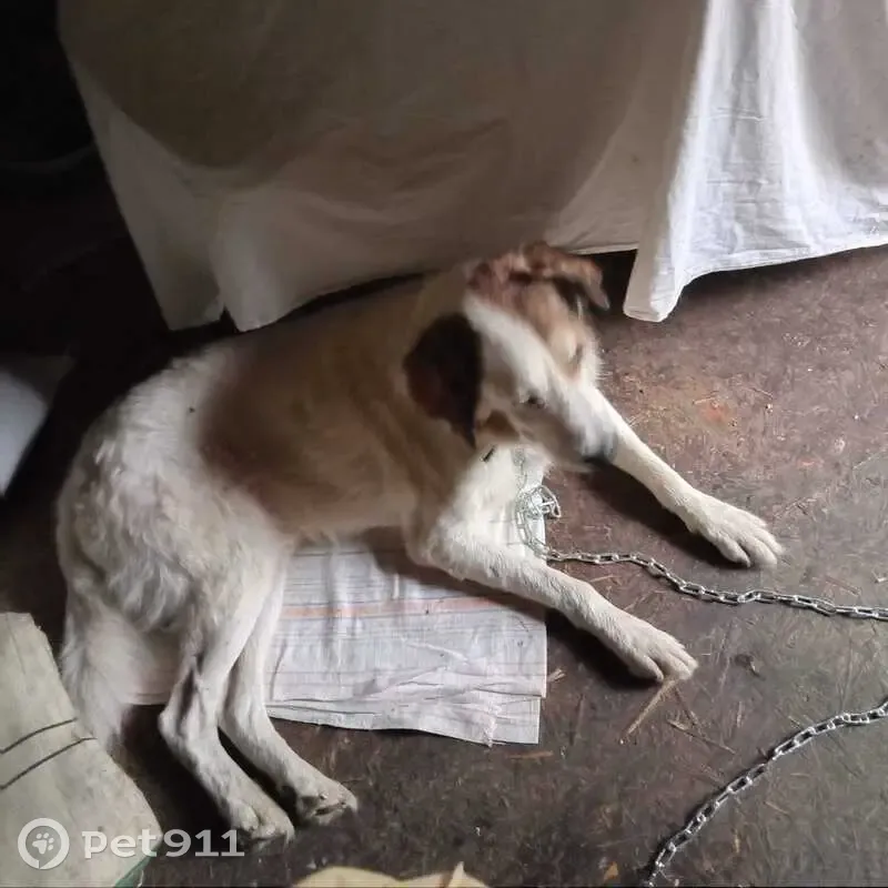 Белый с коричневыми пятнами на ушах умеренно лохматый, мальчик, не кастрирован. Неадекватные личности забрали собаку в Туле или области и привезли в г. Людиново Калужской области. Неопределенное время назад.