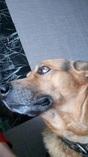 Ласковая,вроде есть след от ошейника,очень ухоженный,буд то домашний
