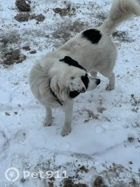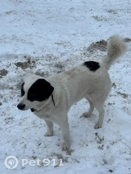 Белая собака с черными пятнами на голове и пятнистым ушком, с ошейником, очень добрый пес, просится в тепло, но его выгоняют из подъездов(( Скулит, видно сильно скучает