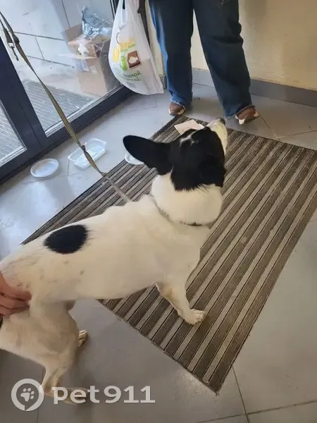 Здравствуйте! Собачка белая с чёрным. Привязана в магазине