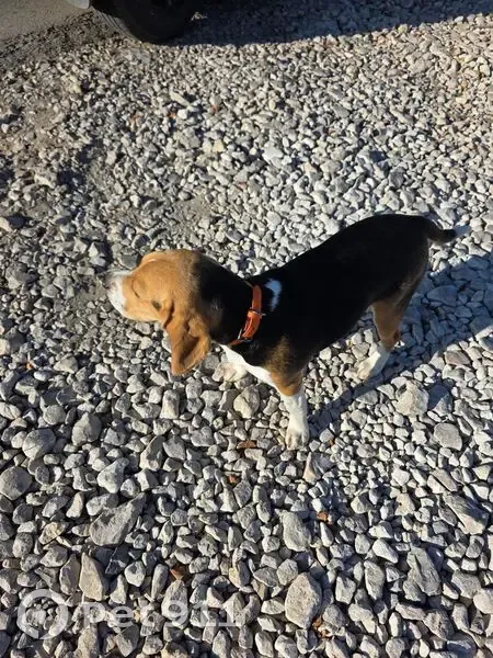 Бегала собака порода Бигль. Оранжевый ошейник...