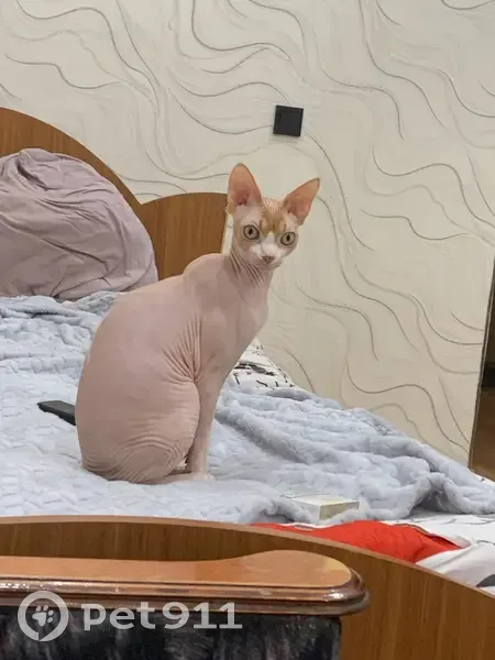 Сфинкс, практически без шерсти, хвост и уши с рыжеватой шерстью, родимое пятно на спине похожее на треугольник. После 12.00 ночи пролез в балконную раму на 1 этаже, искали в подвале дома, не нашли…