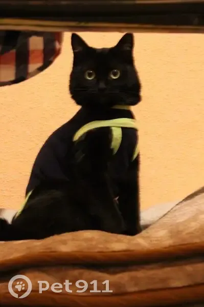 Черная кошка с желто-зелеными глазами и небольшим белым пятнышком на груди. Выпала ночью из окна и убежала. Не умеет мяукать — только негромко "чирикает".