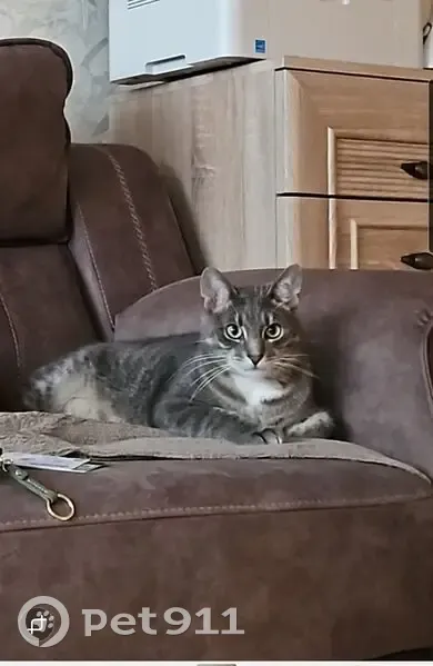 Весь серый в полоску, живот в пятнах серых,как у гепарда. Белый воротничок, длинные ушши прямые. Отзывается на свое имя. Отодвинул сетку на балконе, и спрыгнул. В прошлом году летом нашли на дереве у дома. Сейчас нигде нет его поблизости