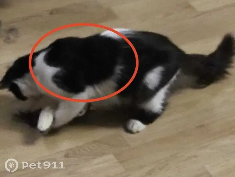 Чёрно-белый кот, не кастрирован, пугливый. Ему чуть меньше года. Особая примета: черный нос и на левой лопатке окрас большого чёрного сердца. На даче выбежал и исчез вчера вечером.