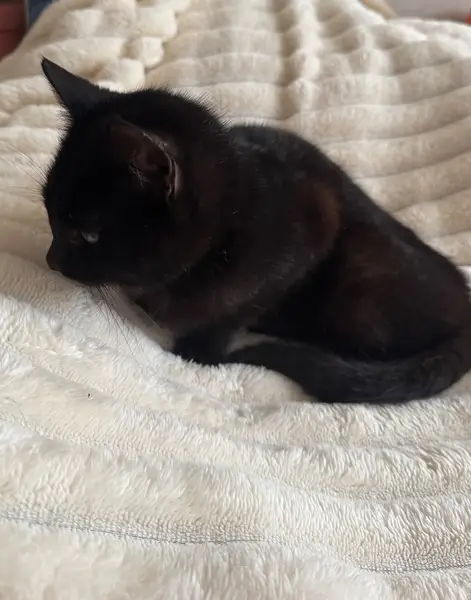 Черный с белым пятном на грудке и на животе кот домашний пугливый глаза зелёные