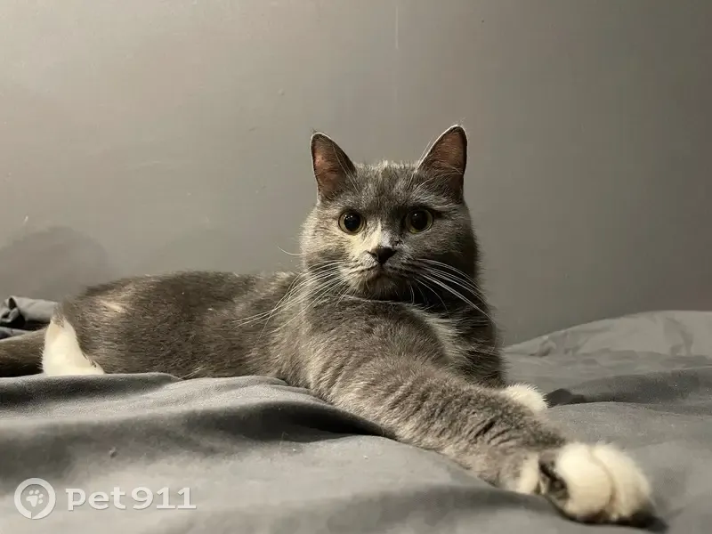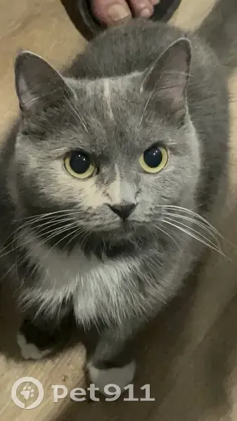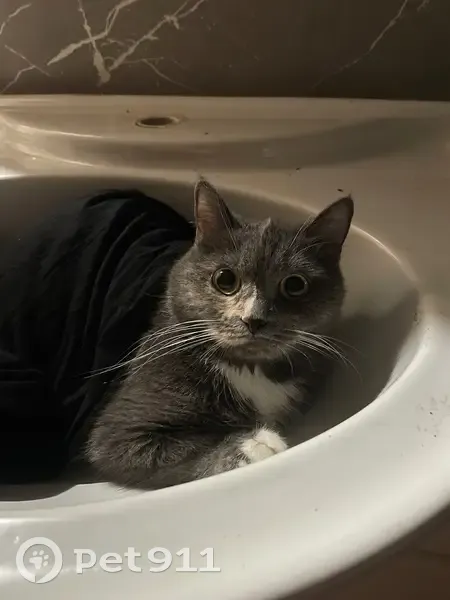 Серая кошечка, грудка белая, лапки как-будто в белый сапожках, есть рыжие вкрапления на спине. Половинчатый носик, черный и коричневый. Спрыгнула с окна где-то в 3 часа ночи.