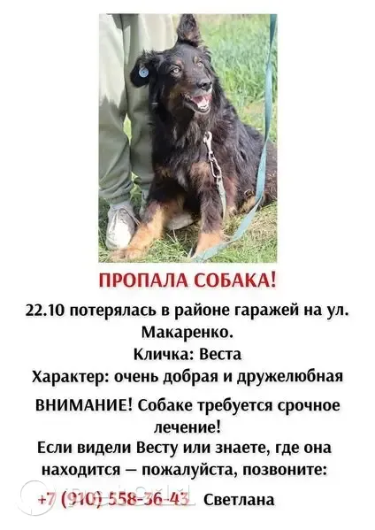Объединено с объявлением rl1092210. Причина-дублирование информации. Описание дублирующего объявления: Помогите в поиске собаки. Может находится в любом районе Тулы. Собака болеет астмой, ей требуется пожизненное лечение, кашляет. Ошейник чёрный со стразами и от блох. Она добрая, придержите и сообщите мне по т.953 424-13-38, 915-690-42-66, я сразу приеду. Если есть возможность разместить объявление у себя в районе, буду благодарна помощи. Вознаграждение гарантируем