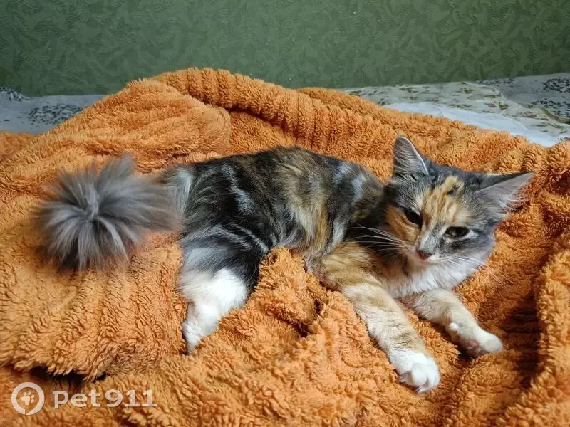 Найдена трёхцветная кошка, домашняя, с ошейником. В поселке Медвенка несколько дней сидела около реки, громко мяукала, выбегала к людям, увязывалась за мной, простилась на руки. Была очень голодная. Очень-очень ласковая. Ищем старых или новых хозяев.