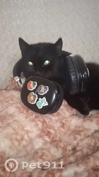 не породистый,зеленые глаза(иногда могут быть желтыми),есть белое пятно на животе и белый воротник на шее,шерсть черная,на спине выгоревшая,постоянно навострённые уши.