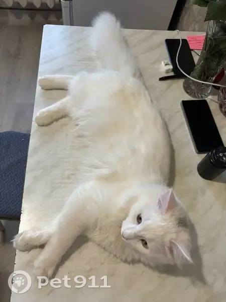 Белый, пушистый, с темно серым пятном на макушке. Выпрыгнул из окна 2 этажа и убежал. Домашний кот , возраст 8 месяцев.