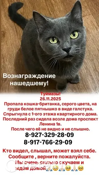 Британка Окрас -серая На груди белое пятнышко в виде галстука К чужим людям не подходит, может шипеть.(т. К привыкла к своим) 26.11.2025 Туймазы! Может кто видел, слышал. Может кто взял себе (увидев что чистая , ухоженная кошка) Сообщите , верните пожалуйста Любая информация будет полезной Очень скучаем по ней Вознаграждение нашедшему