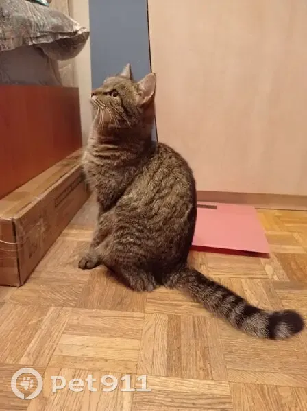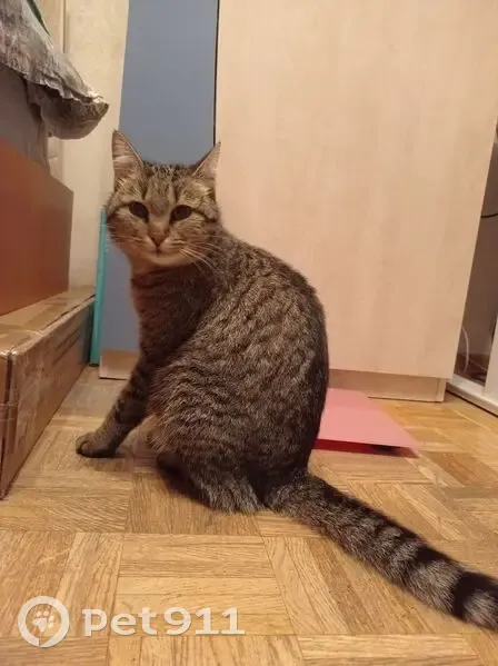 Тигровый окрас, ласковая, была не голодная, не худая (возможно беременна). 17 октября просидела с утра до вечера на остановке Почта в Мамулино, Тверь. В 20.00 забрали в квартиру рядом с остановкой.