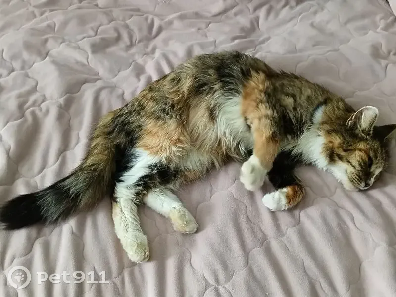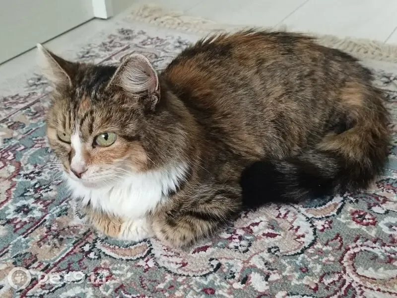 Трехцветная. Пушистая. Черно-рыжая. Грудка и живот белые. На передних лапках белые перчатки. Задние лапки белые. Глаза зеленовато-желтые, миндалевидные. Хвост полосатый, на конце черный. Очень ласковая и контактная. Говорливая. Упитанная. Сидела на морозе в -14 и дрожала.