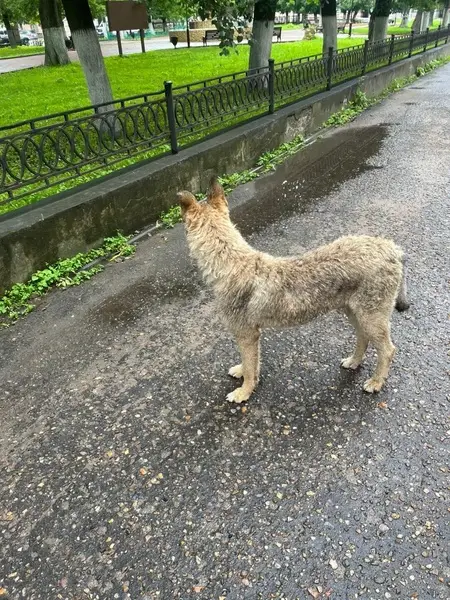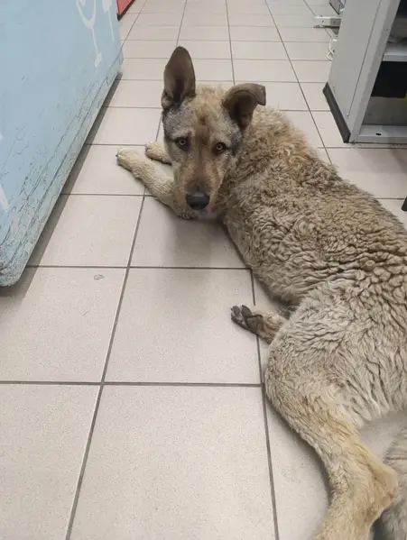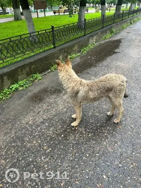 Песик молодой, зубы белые, хорошие, шерсть в хорошем состоянии. Окрас «волчий». Подходит к людям, ко всем магазинам, нюхает, ищет. Возможно, потерялся, слишком ручной.