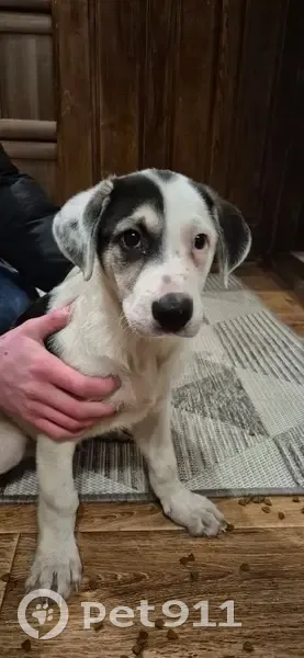 Окрас преимущественно белый, с тёмными пятнами. Кастрированный. Щенок стоял на остановке и громко скулил, очень сильно замерз. Возможно потерялся или был намеренно оставлен на улице.