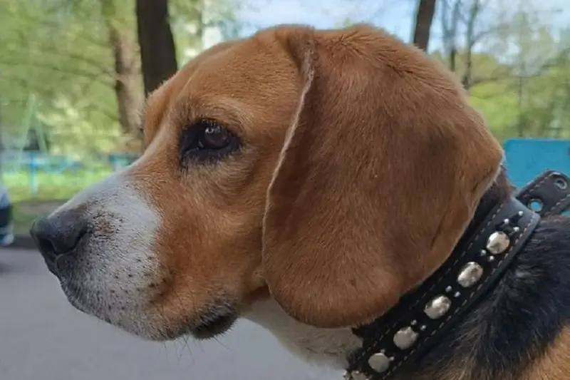 Бигль (триколор), кобель, молодой, с ошейником.