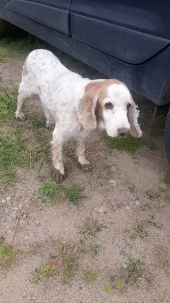 Спаниель. Светлый окрас с тёмными пятнами и тёмными ушами. Спокойная, не агрессивная собака. Не отходит на дальнее расстояние от мусорных баков напротив дома 5кор3 на Ржевской улице. Не бродяжка, видно что домашняя. Просто сидит и смотрит по сторонам в ожидании своего хозяина