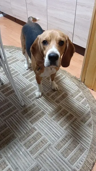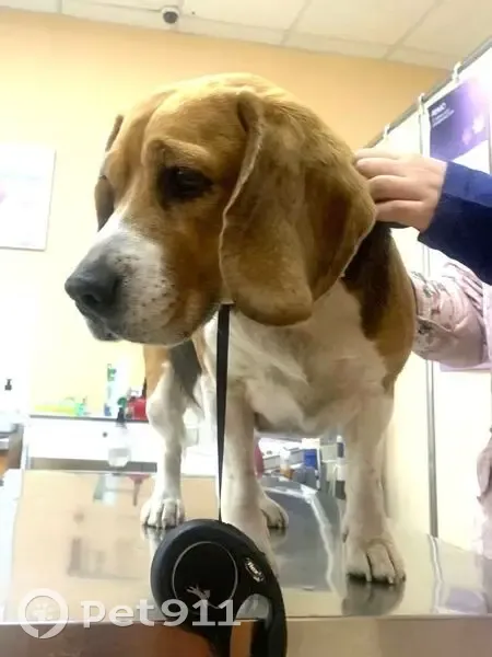 Бигль, сука, толстая, среднего возраста. Была найдена в г. Тверь в районе Речного вокзала на берегу Тверцы. Рылась в помойке.
