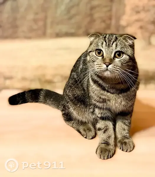 Коричневый окран в чёрную полоску, вислоухая кошка небольшого размера (2-3 кг), на боках у неё черепаший окрас, который напоминает цифру "6". Ушки чёрные. Она упала с окна и пропала.
