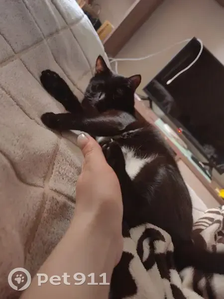 Ночью ускакал через форточку на кухне. Черный с белыми пятнами на груди и животике,необычное белое пятнышко на пальчике задней лапки вокруг когтя. Глаза золотистые . Возраст около года, не кастрирован